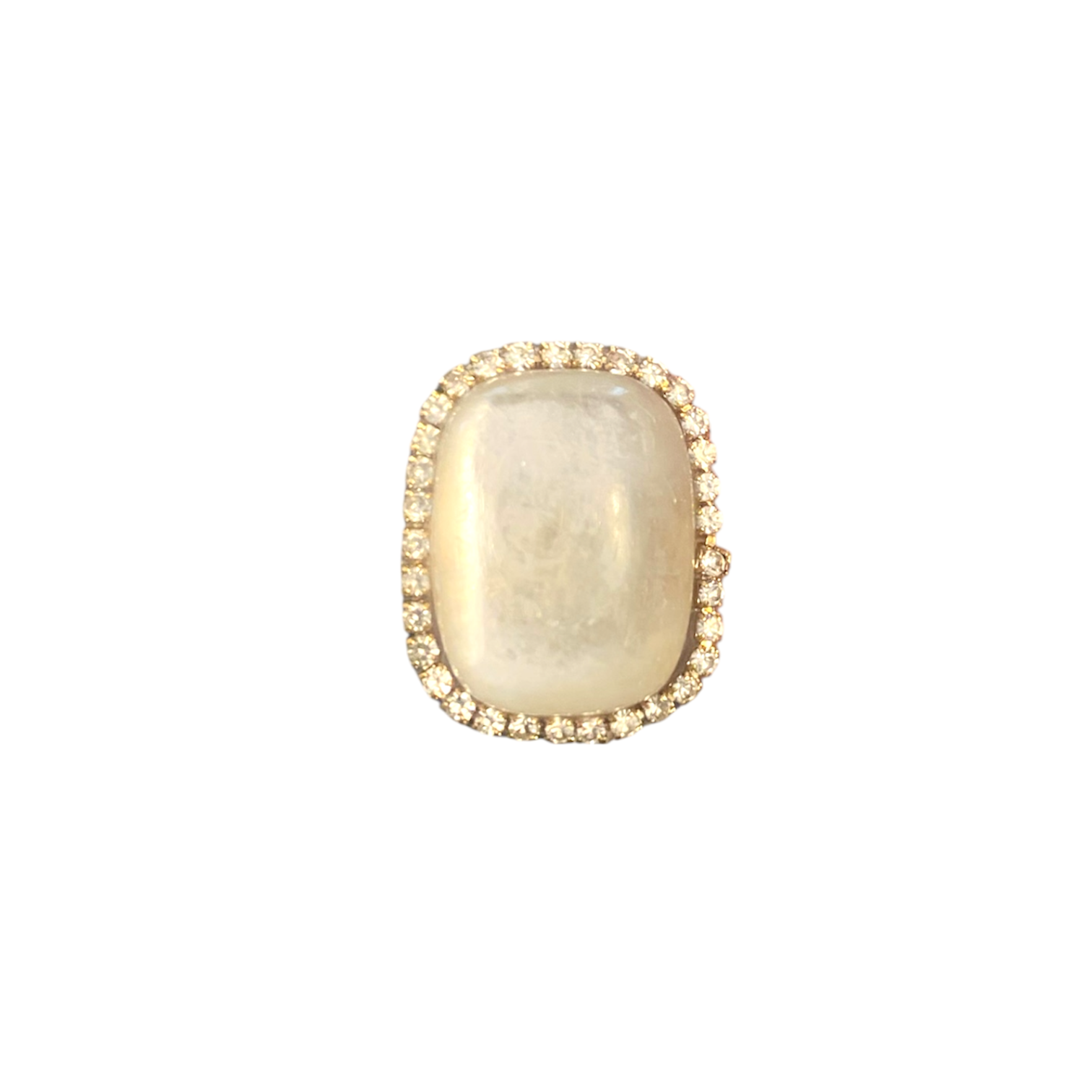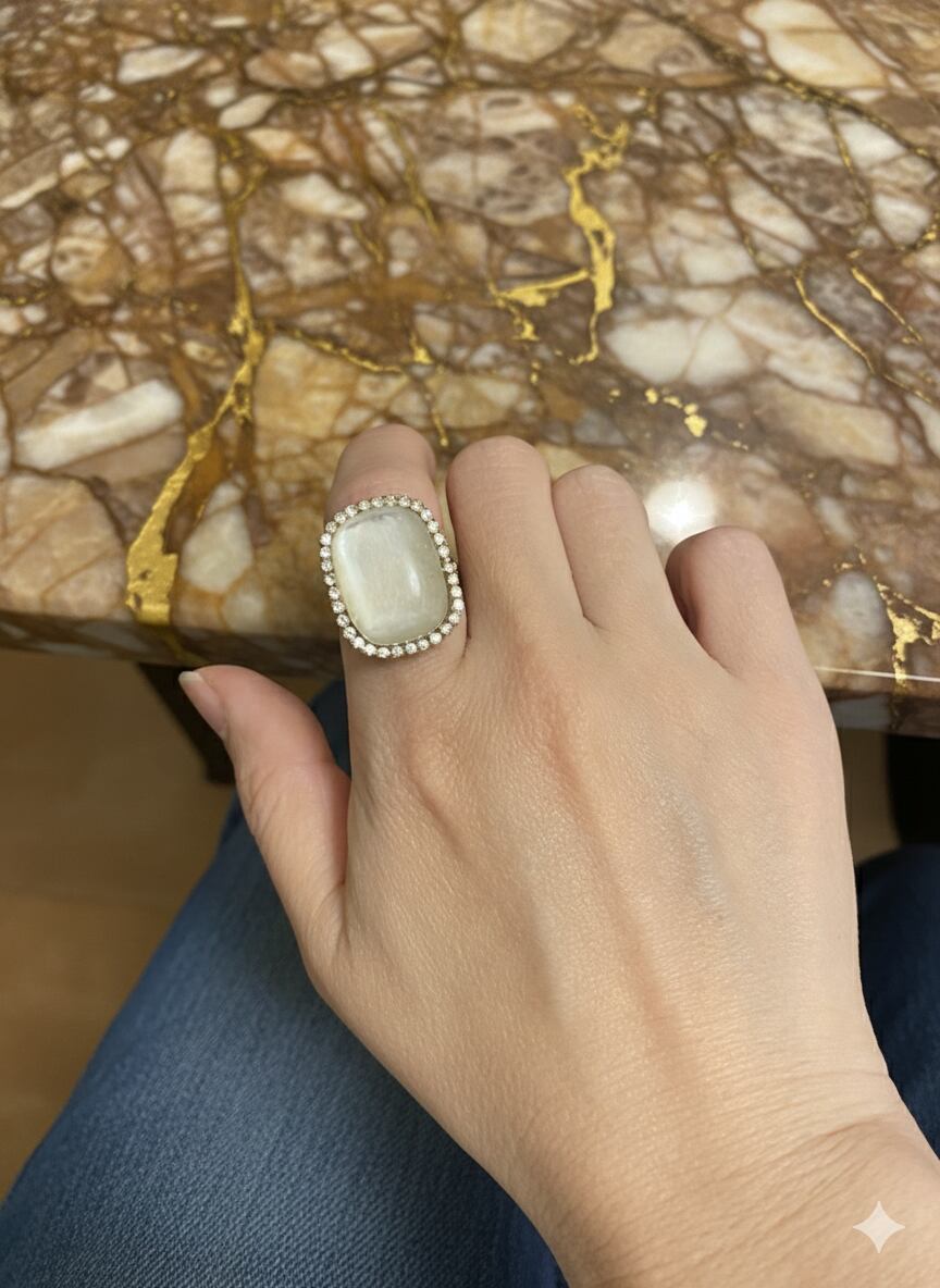 圧倒的な存在感を放つ、大粒のムーンストーンを主役にしたラグジュアリーなリングです。